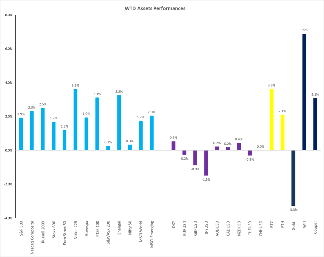 - Crypto Climbs: Ethereum and Bitcoin performed well in the risk-on environment.