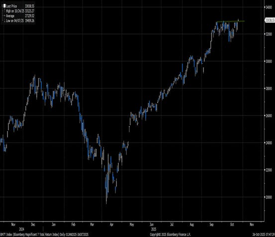 - Big Tech Breakout: The “Fabulous 7” tech giants are leading the charge, with major indices like the S&P and NASDAQ hitting new highs. Passive ETF flows and short-term call options are fueling the rally.