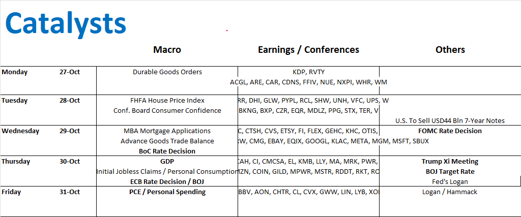 Key upcoming catalysts include a busy earnings week featuring major tech companies such as Microsoft, Meta, Apple, Amazon, and Google, as well as important central bank meetings from the Fed, ECB, Bank of Japan, and Bank of Canada. Additionally, there is anticipation around a potential US-China trade deal, which could influence market direction.