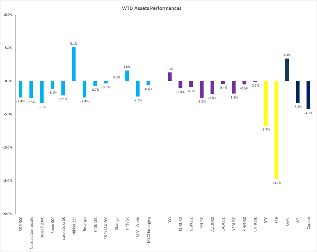 - Crypto: Bitcoin -7%, Ethereum -15%.