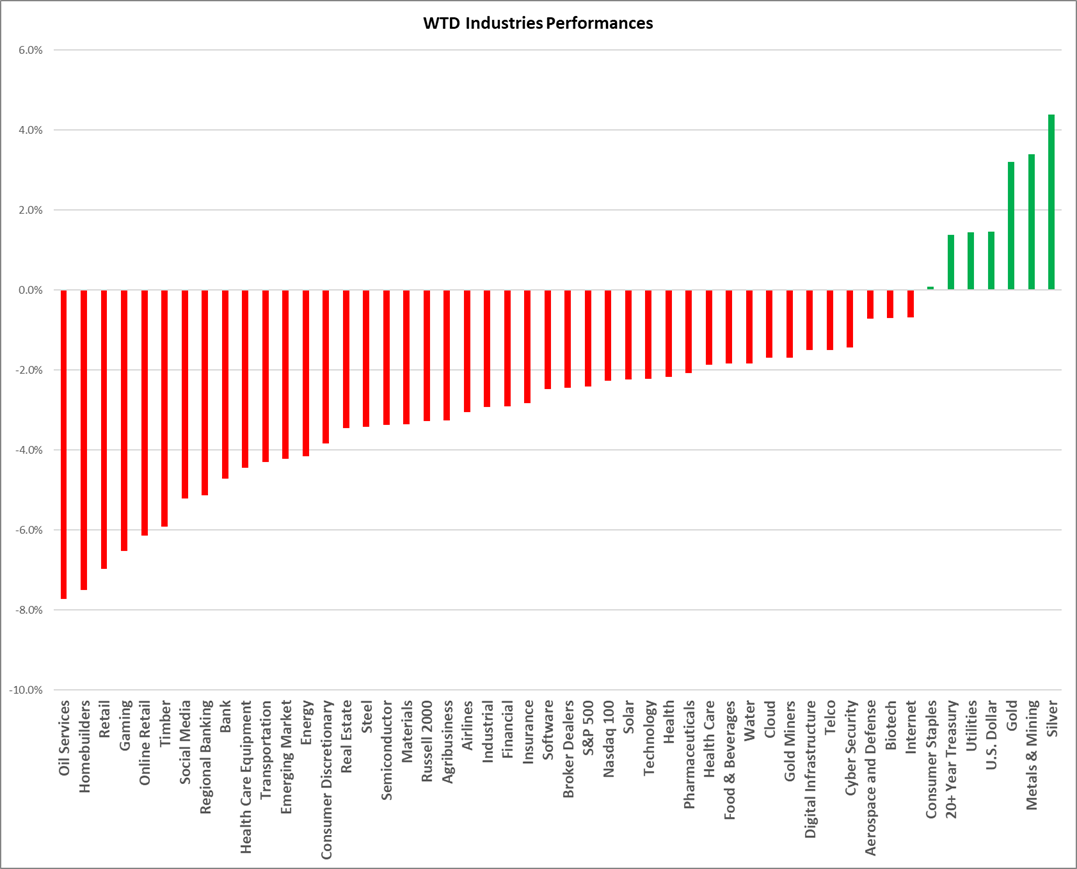 - Resilient: Gold, silver, mining, utilities, treasuries.