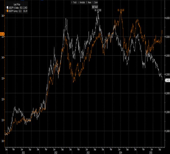 USDJPY (lhs) vs U.S. 10y – JP 10y (rhs)