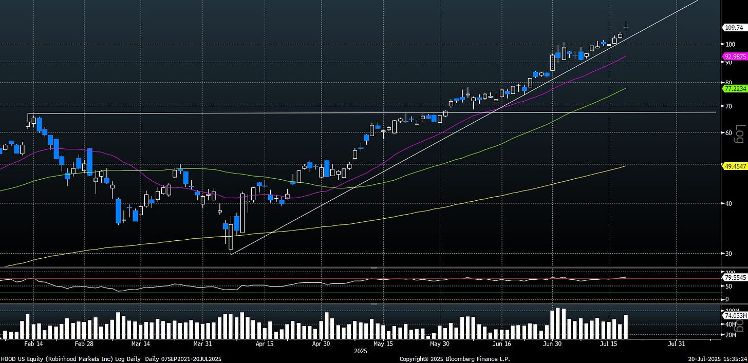 - Robinhood: Broke out at $67 and now trades around $110, rising 50–60%. Despite strong gains, some profit-taking appeared on high volume last Friday. (log chart)