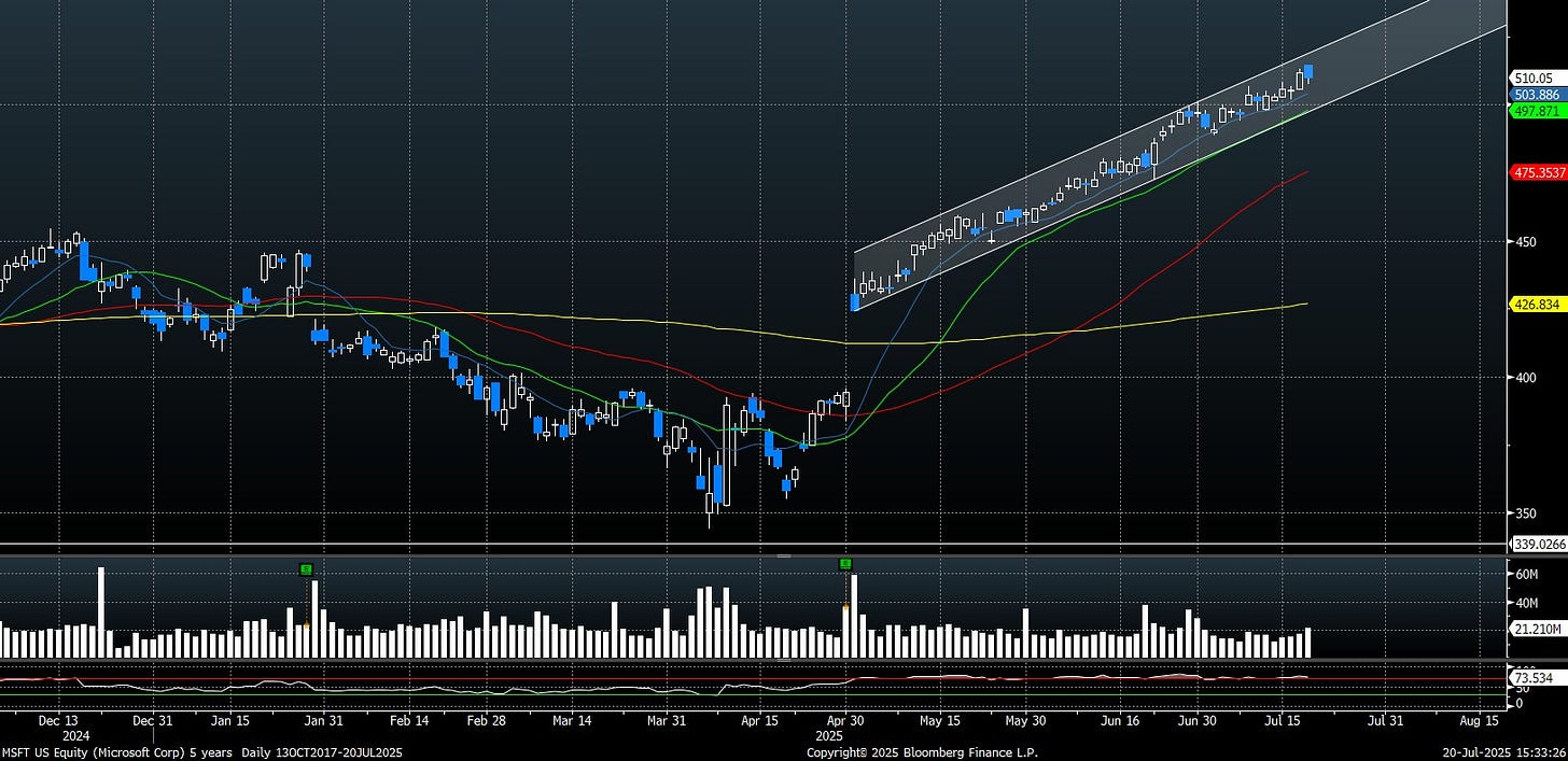 - Microsoft: Since its last earnings gap, the stock has steadily advanced from $425 to $510, demonstrating persistent earnings momentum.