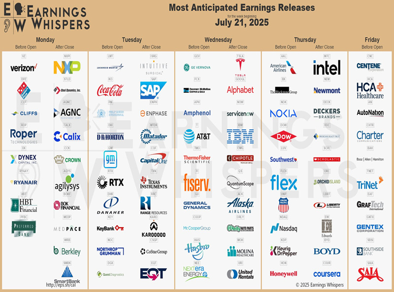 - Earnings Season: Major companies reporting in the next weeks include Coca-Cola, Intel, Tesla, and Google.