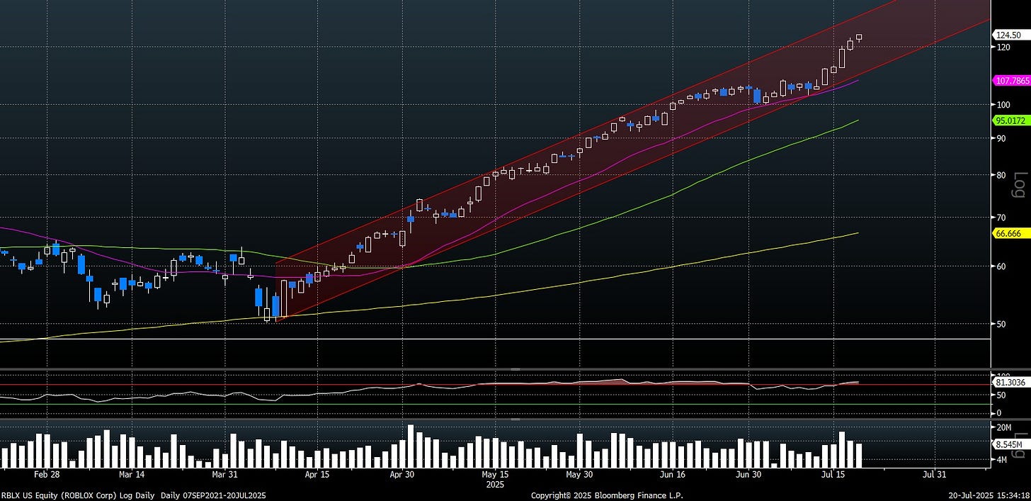 - Roblox: Jumped from $60 to $124.50, doubling in value since its lows. Volume spikes and upgrades from major banks support this move. (log chart)