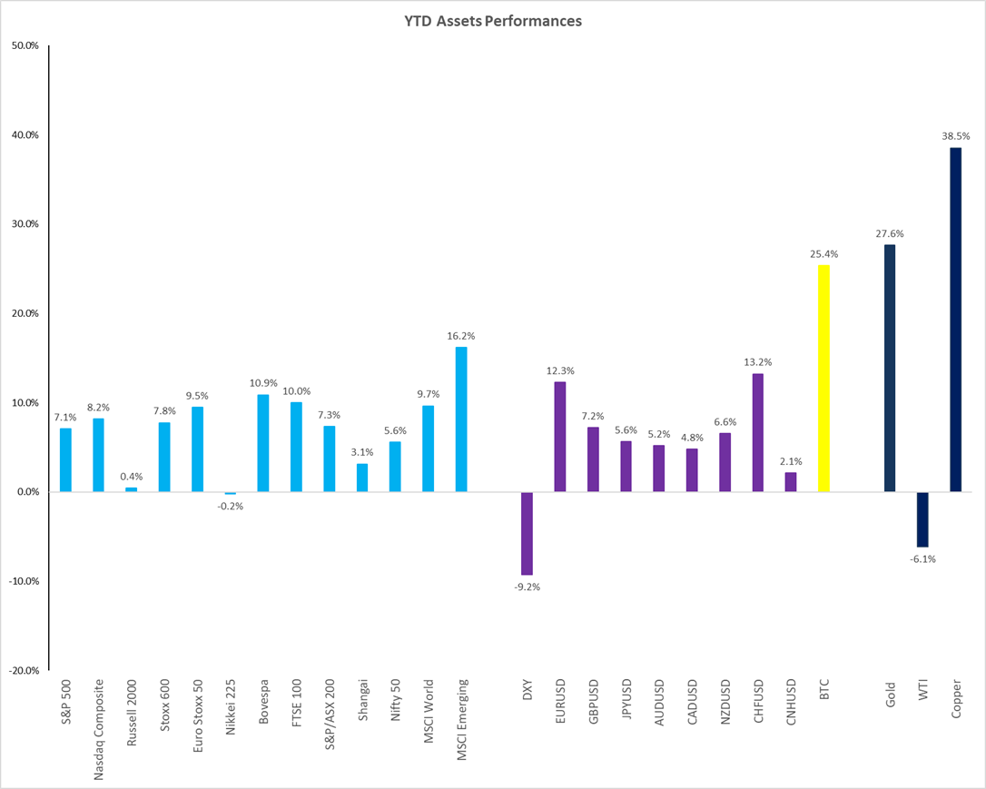 - Asset class performance: The dollar is down 10% for the year, Bitcoin is up 25%, gold up 27%, and copper remains strong due to new tariffs.