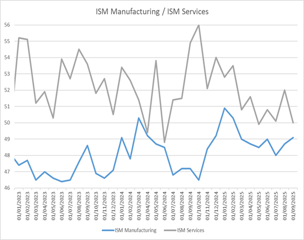 - ISM Manufacturing & Services: Hovering near 50, implying ~1.5% GDP growth