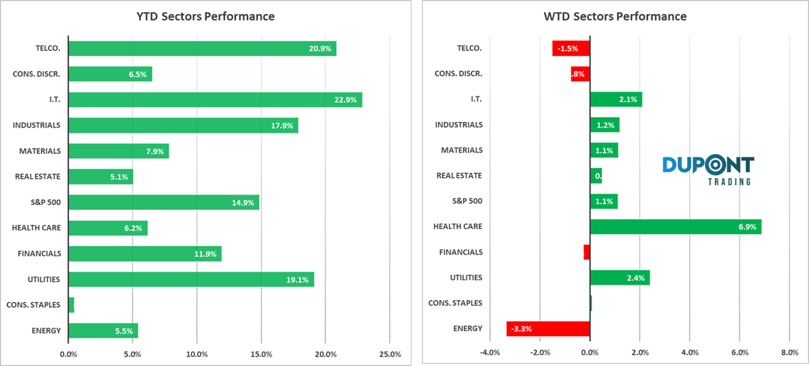 Healthcare (XLV) surged nearly 7%, driven by a major deal between Pfizer and the Trump administration. Biotech also rebounded, making this sector the week’s standout performer.