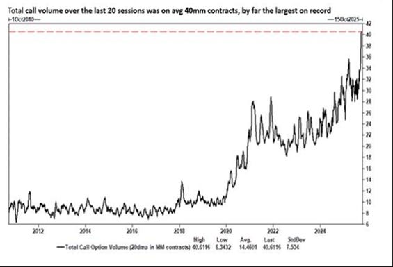 Despite rising equities, the VIX (volatility index) also climbed—an unusual pairing that occurs only ~10% of the time. This signals heavy tail-risk hedging and aggressive call buying.