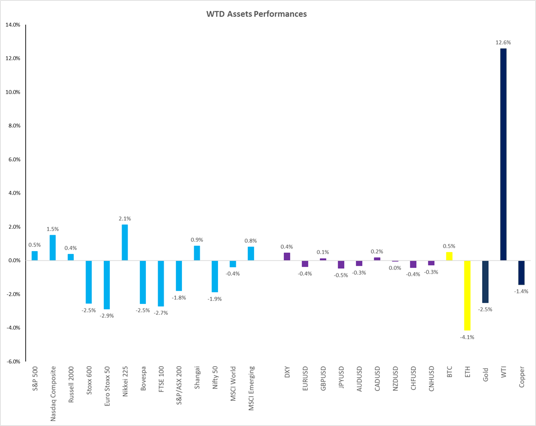 The Week-to-Date (WTD) data highlights a growing fatigue in global equities. While the Nasdaq Composite (+1.5%) and Nikkei 225 (+2.1%) found buyers, Europe is flashing warning signs. The Stoxx 600 (-2.5%) and FTSE 100 (-2.7%) underperformed significantly.