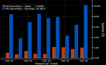 So far, earnings season has been a bright spot. We’ve seen significant positive surprises in both sales and earnings for Q1 2026, continuing a historical trend of beating low expectations.