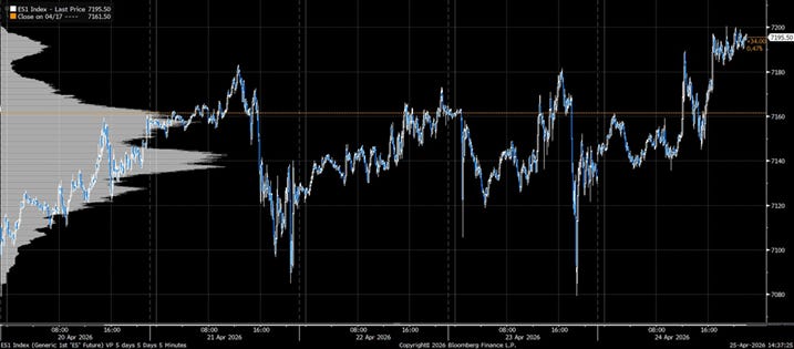 Technical Note: The ES (S&P 500 Futures) has carved out a 100-point range, with significant volume profiles concentrating around the 7140/7160 level. This is the “gravity well” for the index heading into next week.