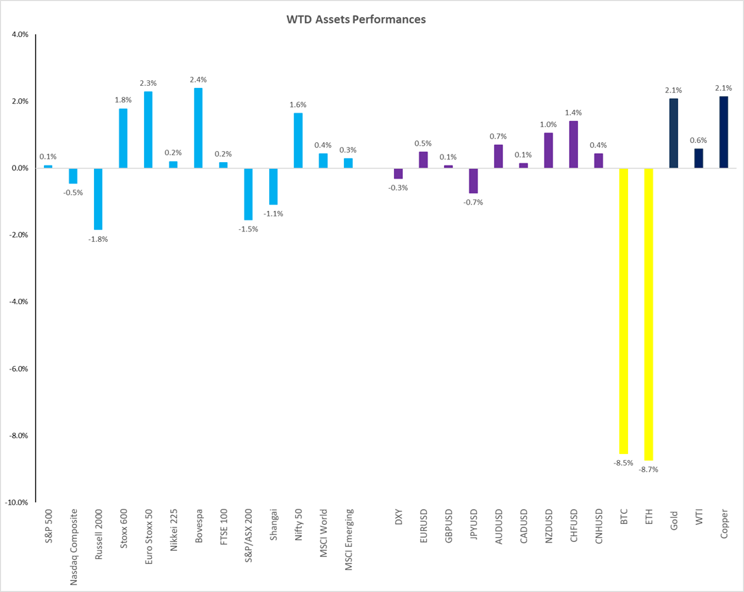 - Global picture: Europe held up well, currencies stayed flat, while crypto sold off hard.