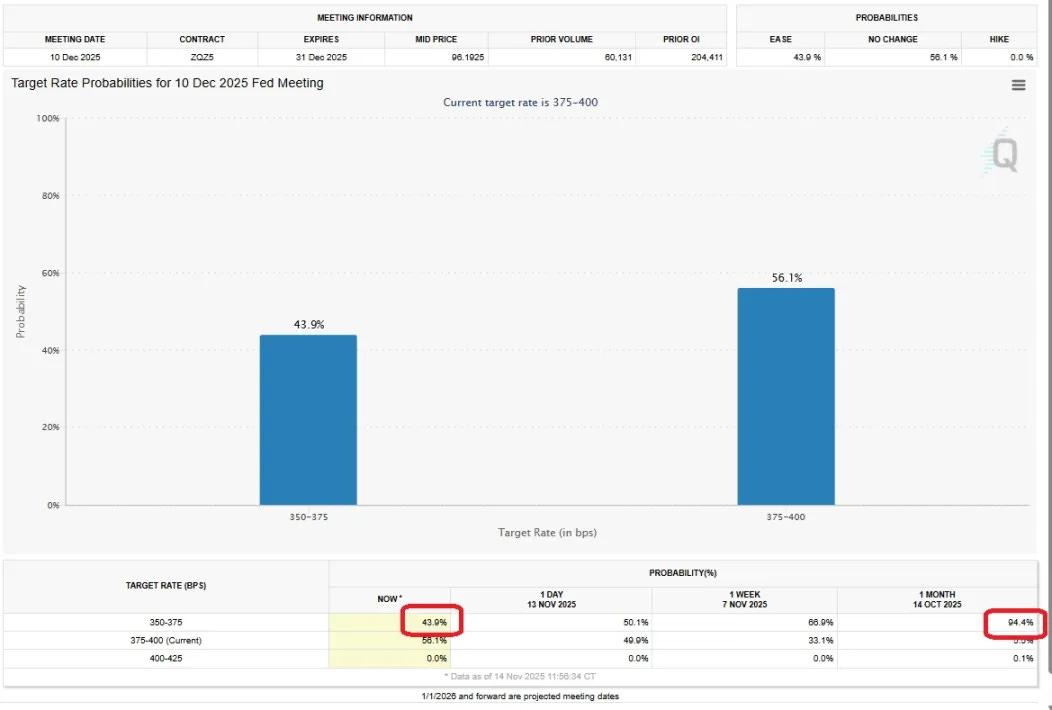 - Fed expectations: December cut odds dropped from 95% a month ago to ~40%.
